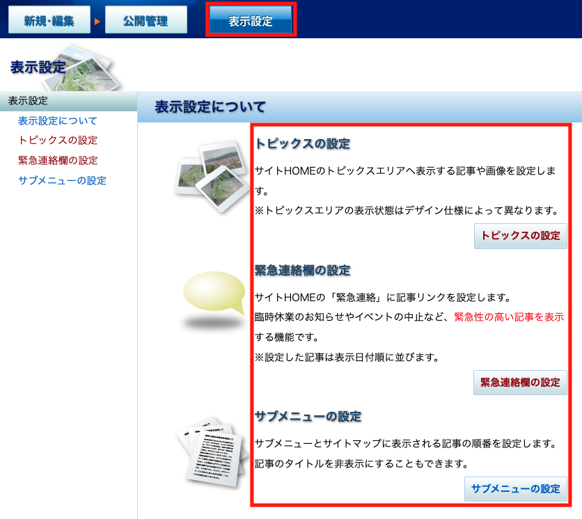 ●サイトHOMEの「トピックス」「緊急連絡欄」の設定。●記事の「サブメニュー」の設定。※サブメニューは記事の順番を設定したり、記事のタイトルを表示させないようにすることができます。