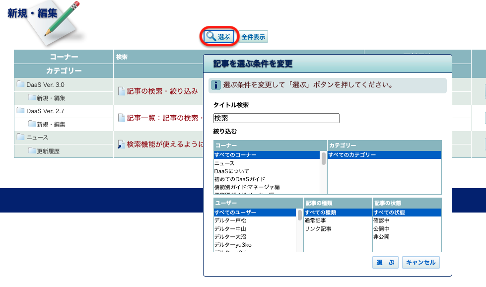 コーナー、カテゴリー、ユーザー、記事の種類、記事の状態を選択