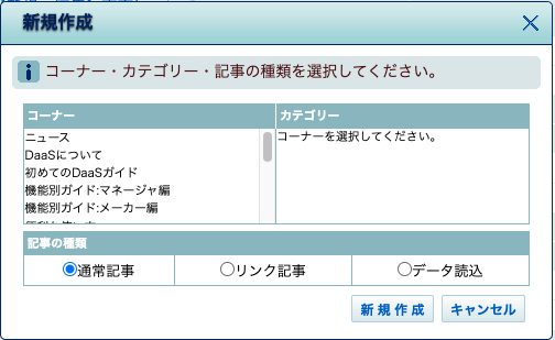 新規記事の作成。 ・HTMLメーカーを使用する「通常記事」 ・特定の記事や別サイトにリンクする「リンク記事」 ・他のDaaSサイトで作成した記事を複製(コピー)できる「データ読込」