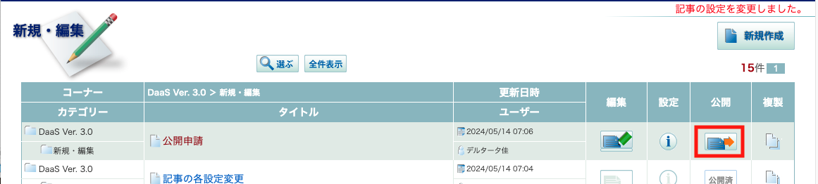 【公開申請】ボタンをクリックすると【公開管理】画面へ記事が移行