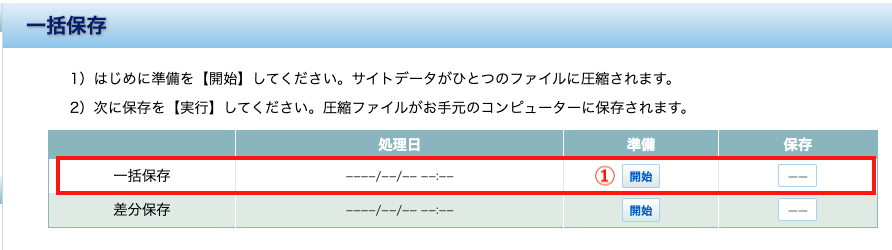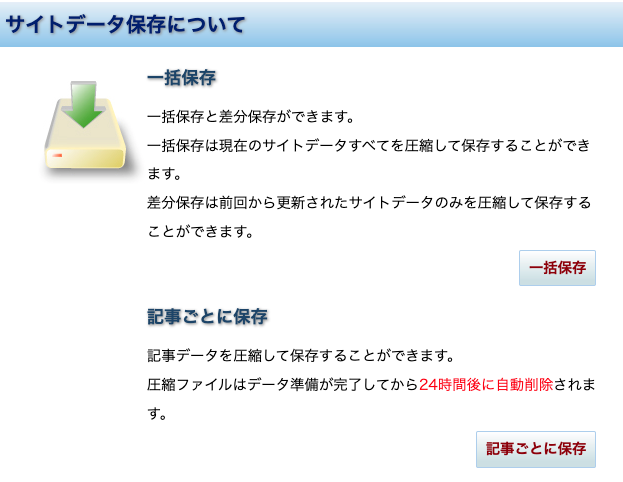 一括保存では、現在のサイトデータすべてを圧縮して保存。