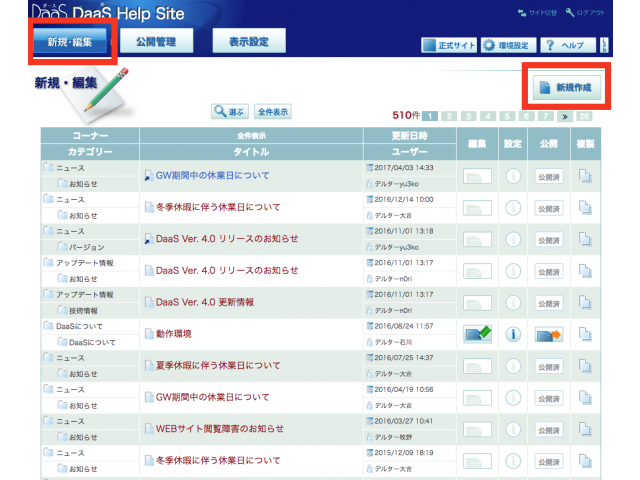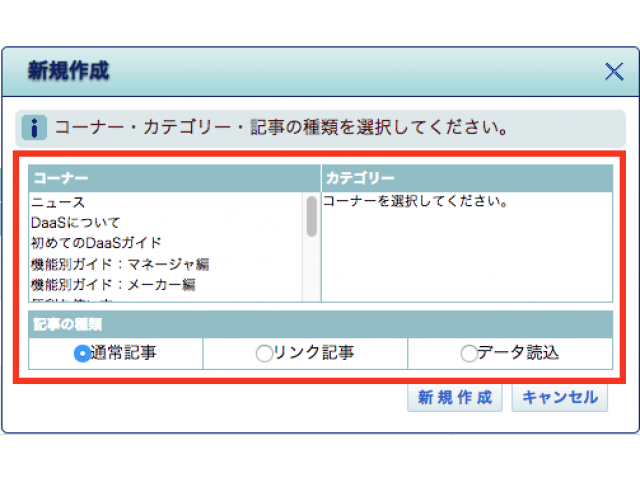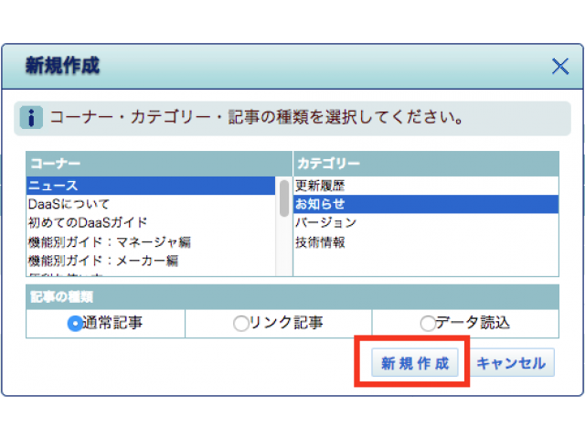 2)コーナー名、カテゴリー名、記事の種類を選択したら、ウィンドウ下にある【新規作成】 ボタンをクリックします。