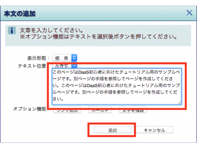 下図のように本文の入力ができたら【追加】ボタンをクリックします。