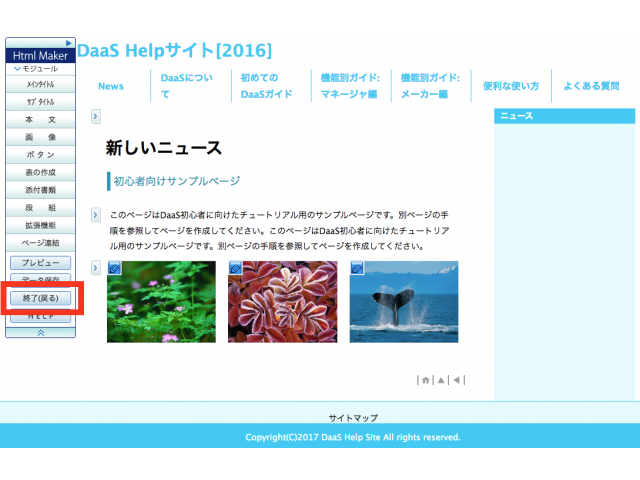 画面左側の「HTML Maker」メニューから【終了(戻る)】ボタンをクリックします。