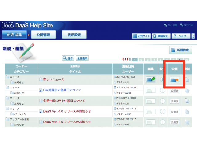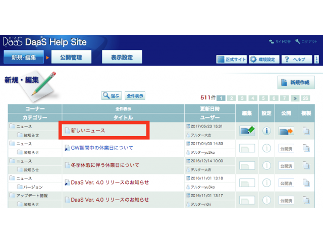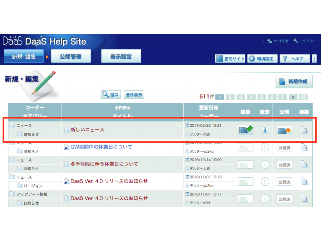 コンテンツマネージャーの「新規・編集」画面から「新しいニュース」のタイトルをクリックします。