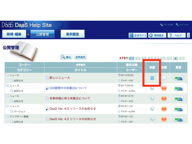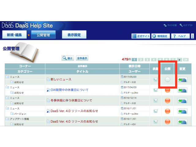 「公開管理」画面に移行します。