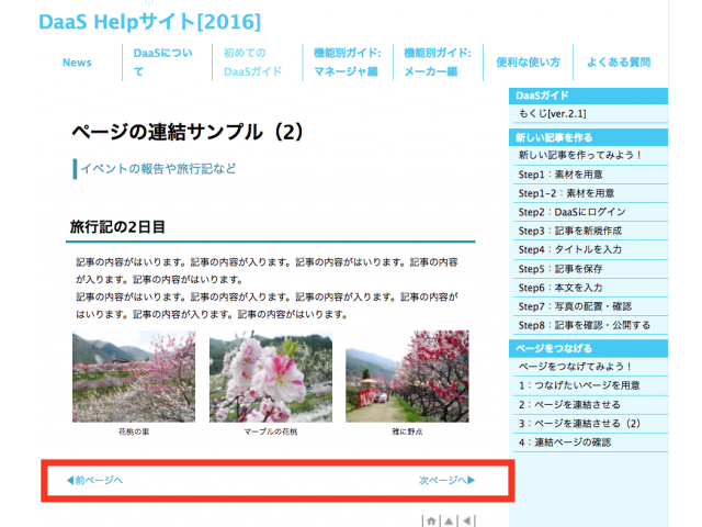 記事の内容が多すぎて数ページに分けたい場合など、関連記事をつなげるには【ページ連結】を利用します。下にあるサンプルページのように、記事の下に「次のページ」「前のページ」へのリンクが追加さます。